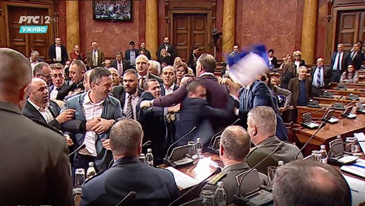 N1 navodi da je tada nastao opšti metež i guranje u kojem je, pored poslanika Dveri i vladajuće koalicije, učestvovao i ministar odbrane Aleksandar Vulin. Jedan od poslanika SNS-a oteo je transparente poslanicima Dveri i pocepao ih.