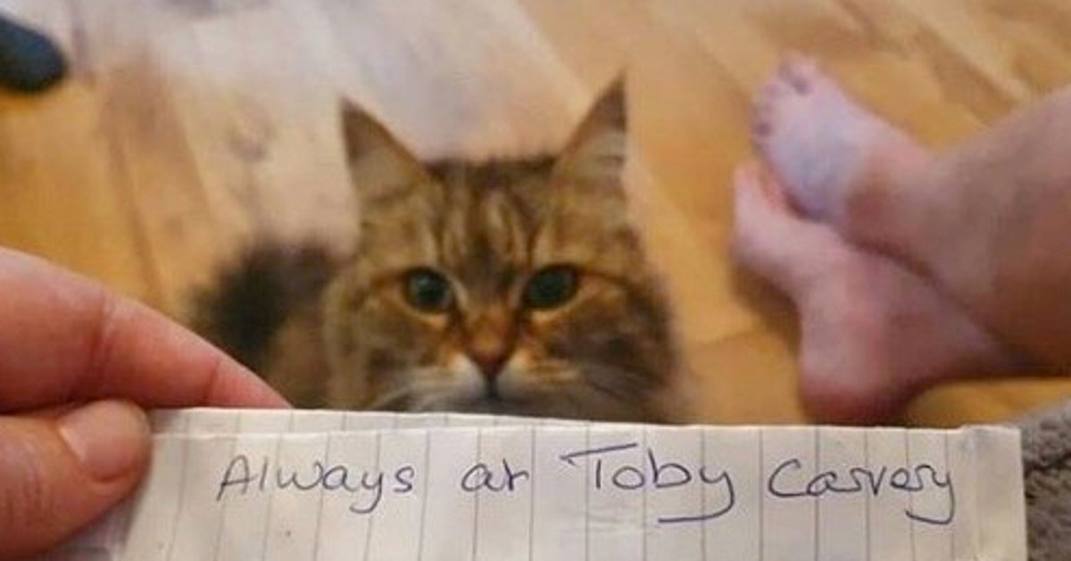 「どなたかこの猫ちゃんを飼っていますか?」。さらに裏側にはこう書かれていた。「この猫ちゃんは、いつもトビー・カーベリーにやって来ます」