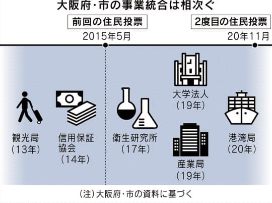 府・市の事業統合はここ数年相次ぐ。17年には現在、新型コロナウイルス対応にあたっている「大阪健康安全基盤研究所」(大安研)が発足した。前身の府立公衆衛生研究所と市立環境科学研究所が統合した衛生研究機関だ。
