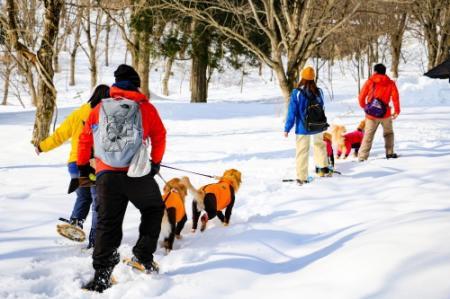 かんじきやスノーシューを履いて愛犬と植物園内を散歩する利用者たち=香美町村岡区和池(たじま高原植物園提供)