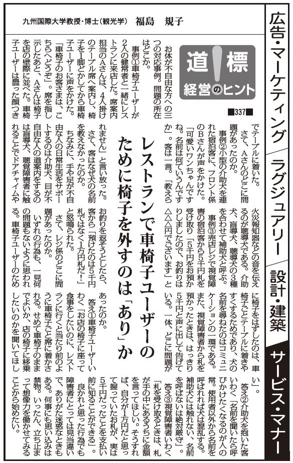 からの記事と詳細 ( 【道標 経営のヒント 337】レストランで車椅子ユーザーのために椅子を外すのは「あり」か 福島規子 | - 観光経済新聞 )