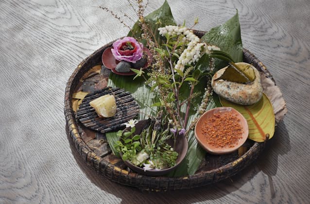 レゼピさんは四国遍路を回ったり、度々、京都近辺の山を歩いたりした。「そのなかで自然が意外に近いと新たに実感した」。コースは植物の香りや食感であふれている。「八寸」の名が付いた一皿目には野草や花が一面に並ぶ。バラの花はイチゴなどの果実を詰めたセミドライトマトを載せて食べる。甘酸っぱくフルーティーな味わいと香りが自然の美しさを一層印象づける。