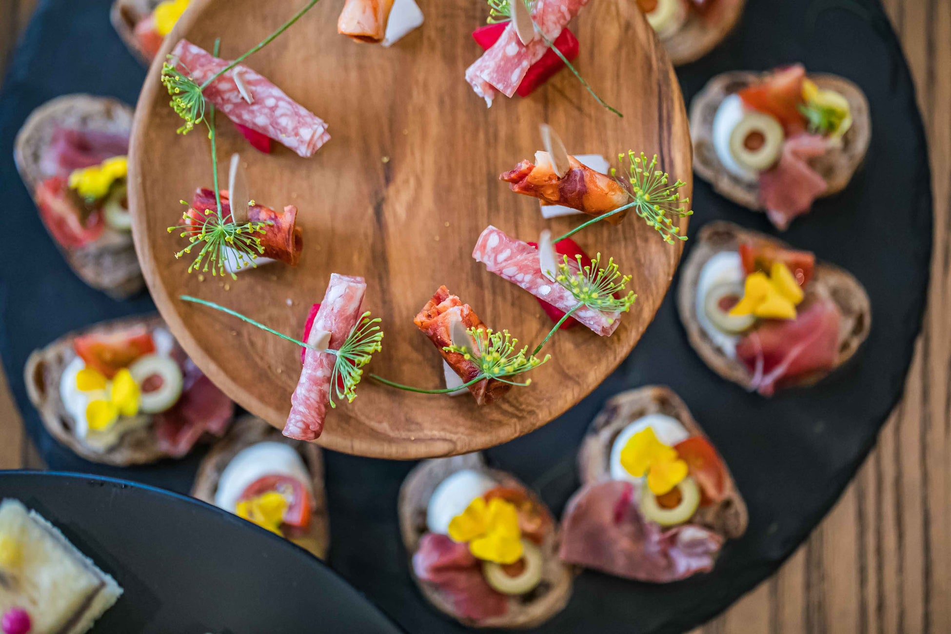 オードブル:生ハム原木カービング、ラクレットチーズ、カプレーゼ、野菜テリーヌ、