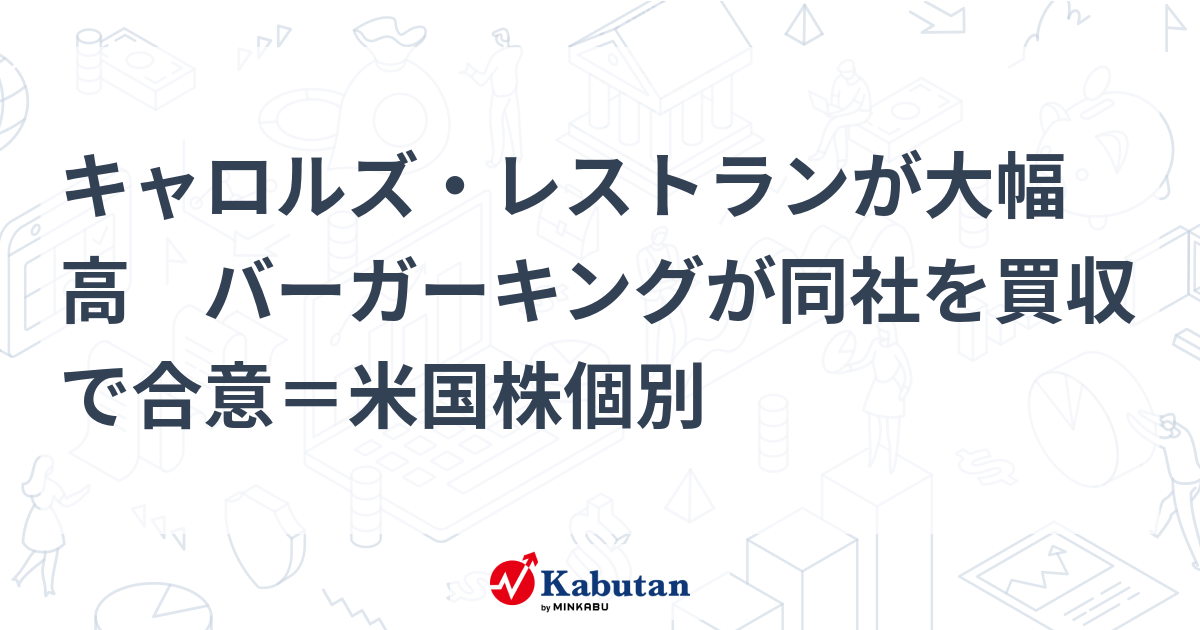 からの記事と詳細 ( キャロルズ・レストランが大幅高 バーガーキングが同社を買収で合意=米国株個別 | 個別株 - 株探ニュース )
